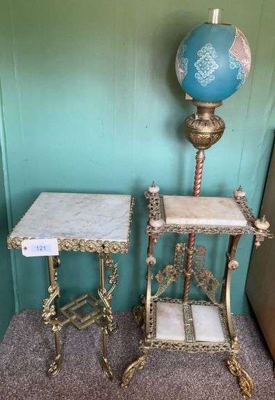 LOT 121 - Brass And Marble Table, 16"X16"X29" (One Leg Needs Repair), Brass And Marble Table With Lamp, 22"X17"X60"